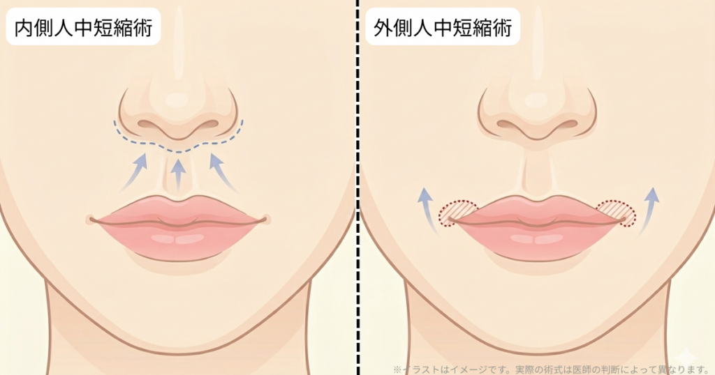 | 種類 | 内側人中短縮術・外側人中短縮術・ボトックス法の3種類 |