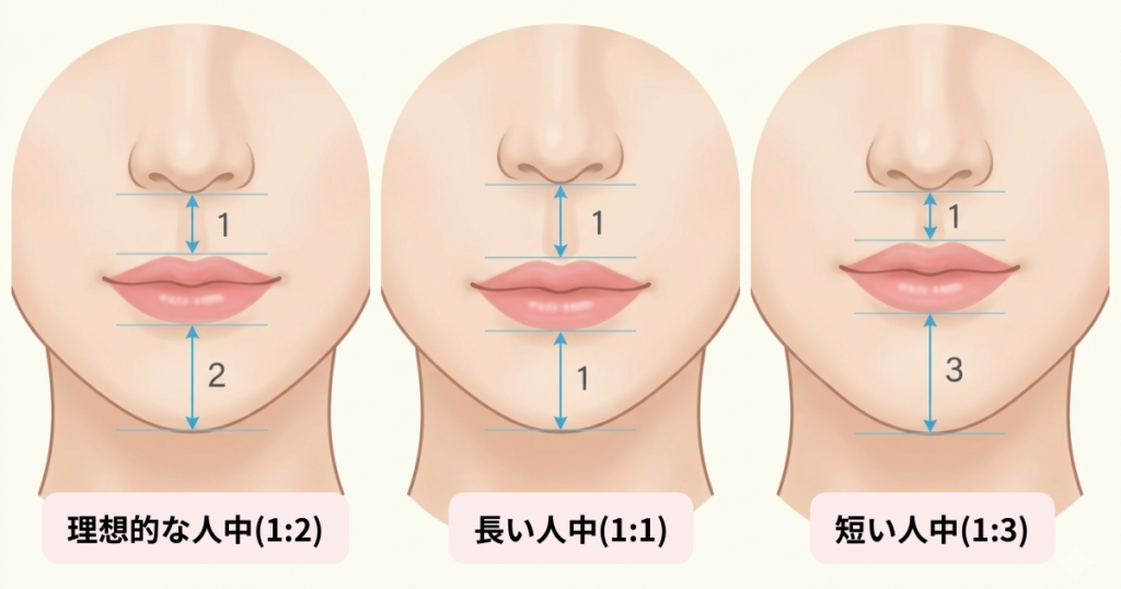 美しいとされる顔の比率として、「鼻下から上唇まで:下唇から顎先まで=1:2」という黄金比があります。この比率に近いほど、バランスの取れた口元に見えるとされています。